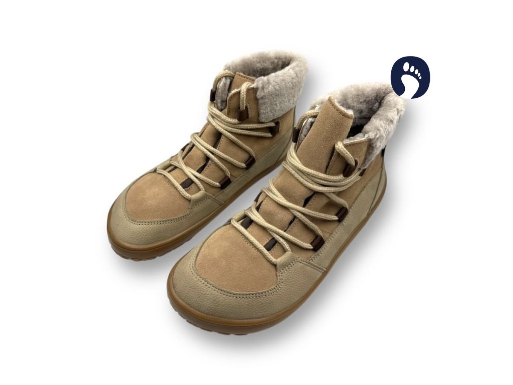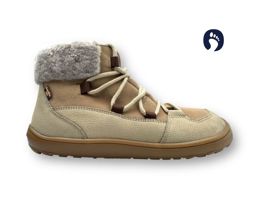 Hrejivé a vodoodolné barefoot čižmy s TEX membránou, vlnenou/kožušinovou podšívkou a pružnou Lifolit® podrážkou – zapínanie na šnúrky pre presné dotiahnutie; moderný odtieň Taupe.
